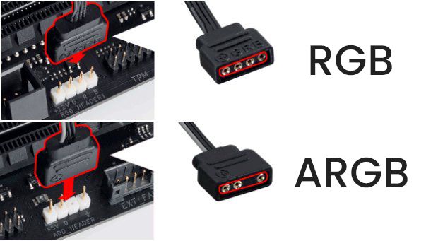 Abschnitt betitelt „Wie erkennt man den Unterschied?“Am einfachsten lässt es sich daran erkennen, dass 12-Volt-RGB einen 4-poligen Anschluss benötigt, während 5-Volt-ARGB nur 3 Pole hat.
