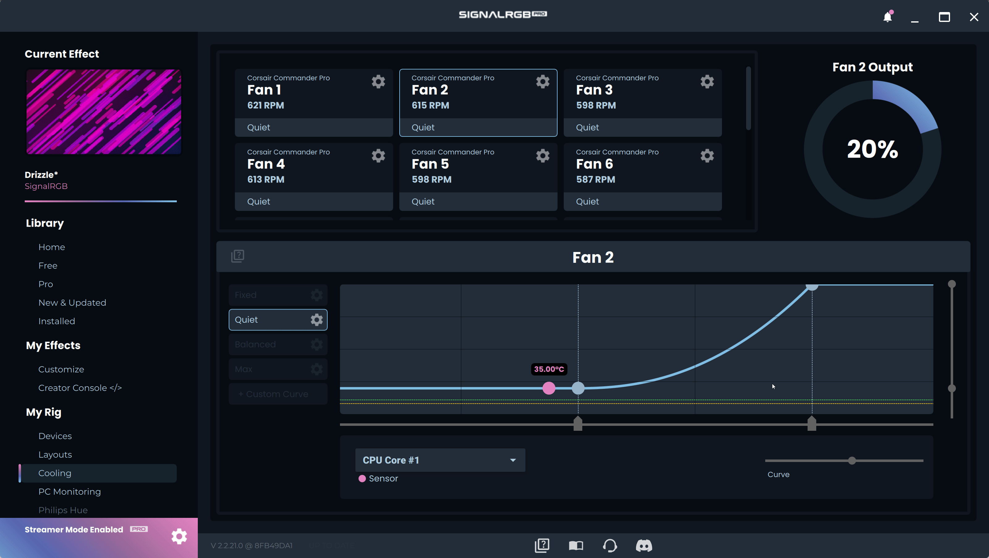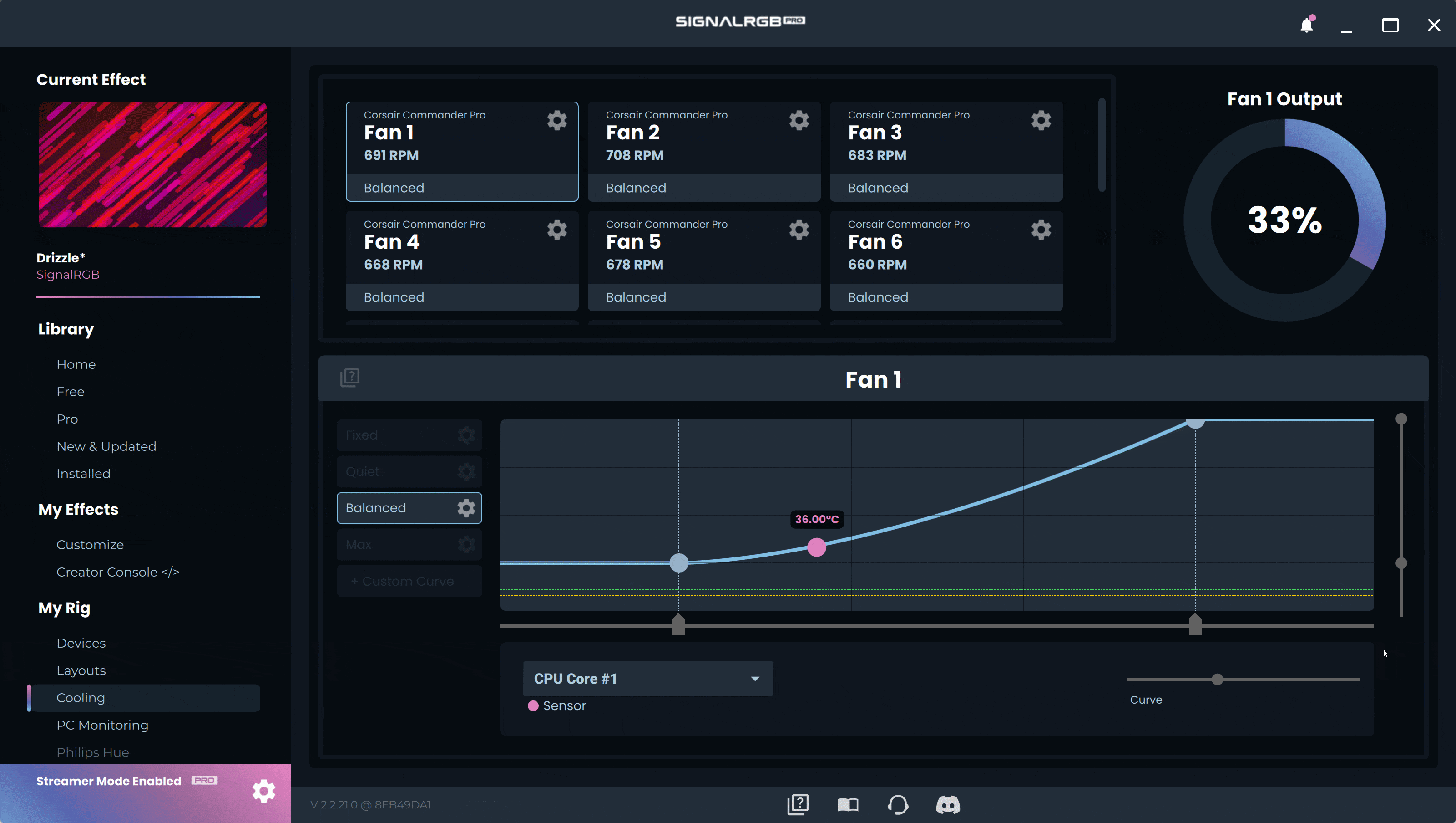 Le refroidissement est une fonctionnalité exclusive à SignalRGB Pro qui permet aux utilisateurs disposant de contrôleurs de ventilateurs pris en charge de contrôler la vitesse de leurs ventilateurs. Vous pouvez régler la vitesse des ventilateurs individuellement et créer vos propres courbes de ventilateur pour personnaliser le refroidissement et les performances de votre système.