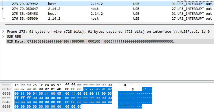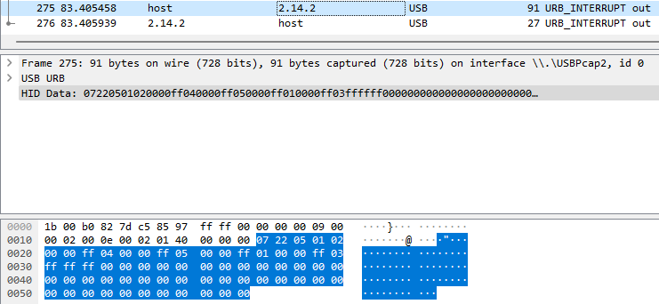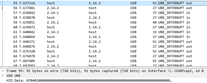 - Faites défiler jusqu’à trouver un type URB_INTERRUPT OUT ou SET_REPORT Request