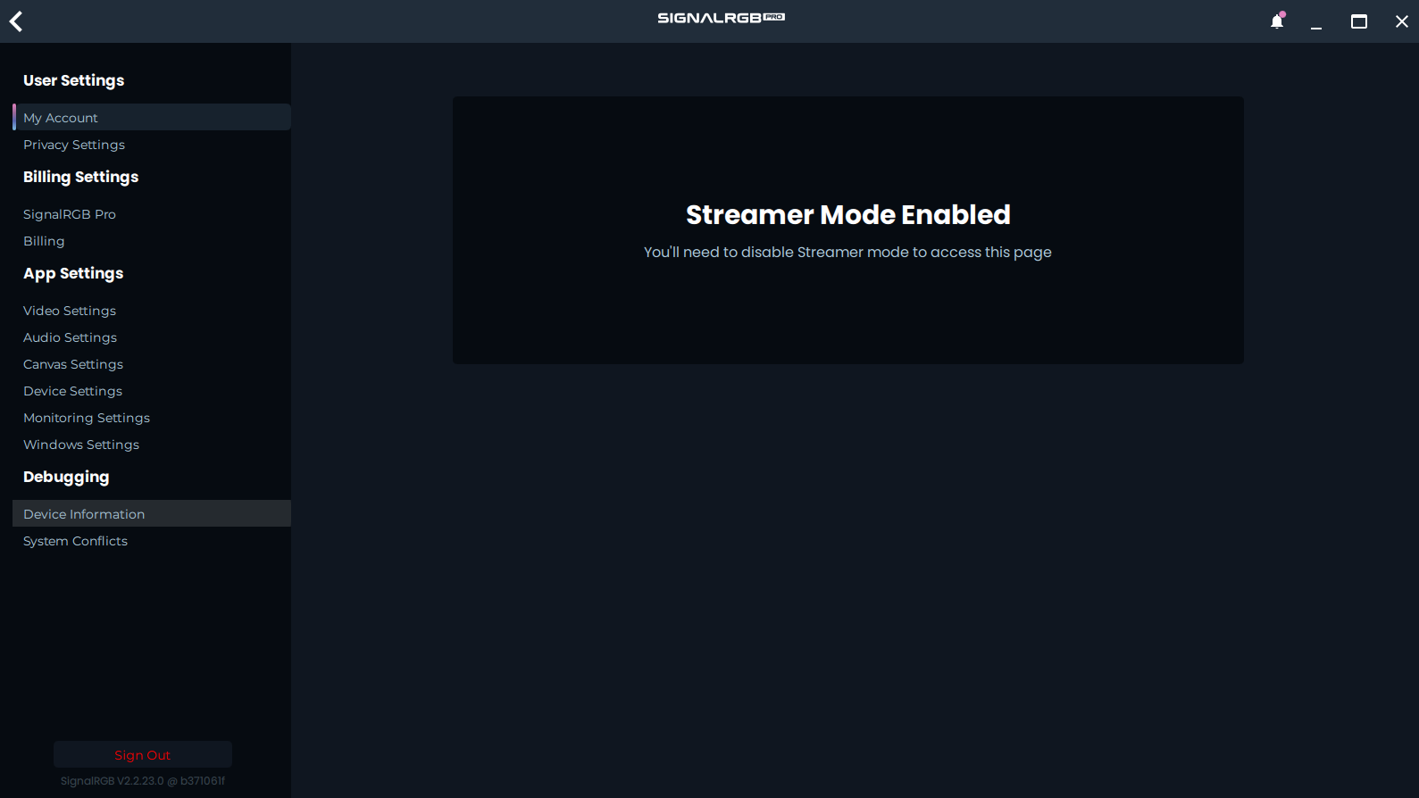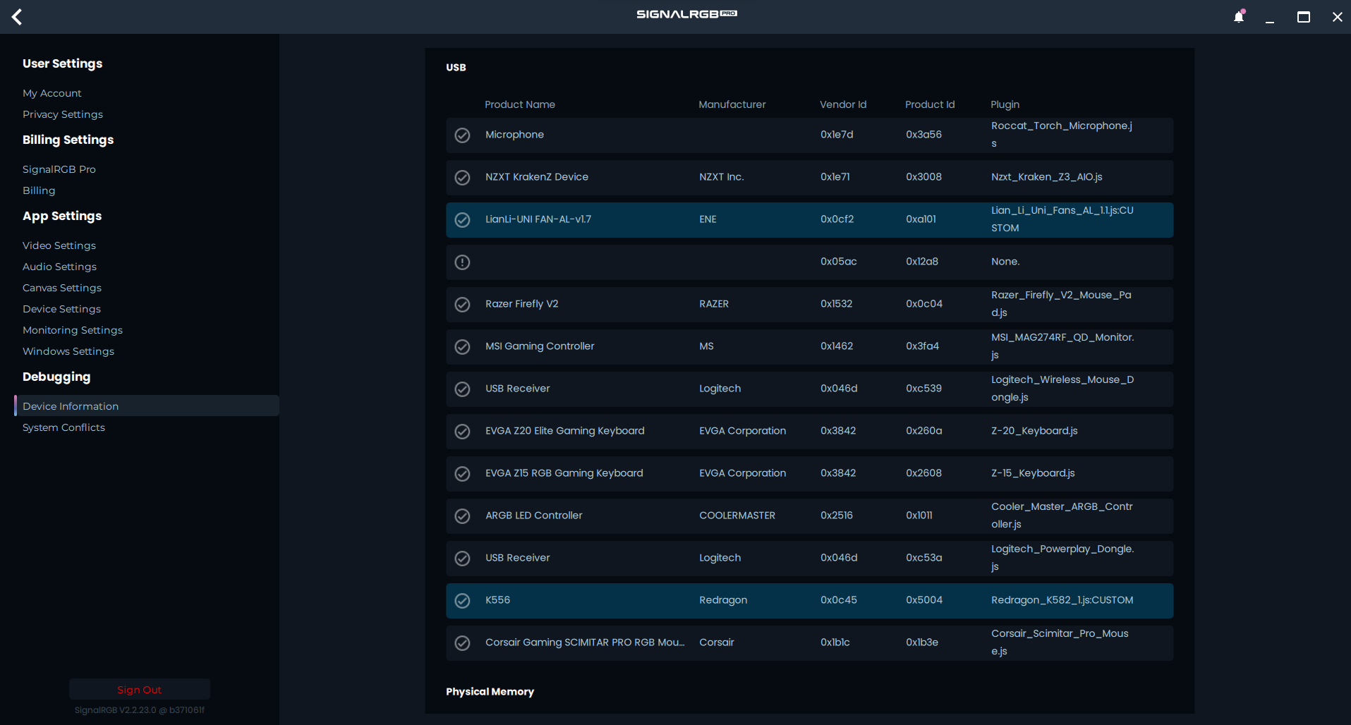 Section intitulée « Trouver les identifiants fournisseur et produit »Pour trouver l’identifiant fournisseur (Vendor ID) et l’identifiant produit (Product ID), nous devons d’abord ouvrir le menu des paramètres de SignalRGB en utilisant l’icône d’engrenage dans le coin inférieur gauche.