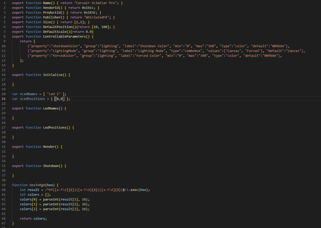 var vLedNames = [ "Led 1", "Led 2", "Led 3", "Led 4", "Led 5" ];var vLedPositions = [ [0,0], [1,0], [2,0], [3,0], [4,0] ];Nous donnons à ces quatre LEDs des mappages de base pour l’instant, car nous ne savons pas encore où se trouvent physiquement ces LEDs sur notre appareil par rapport à leurs mappages dans SignalRGB.