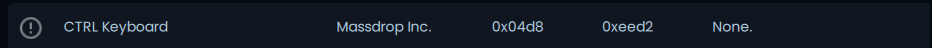 export function Name() { return "Massdrop CTRL QMK Keyboard"; }export function VendorId() { return 0x04d8; }export function ProductId() { return 0xEED2; }export function Publisher() { return "WhirlwindFX"; }- Maintenant que les champs sont remplis, nous passons aux tableaux.