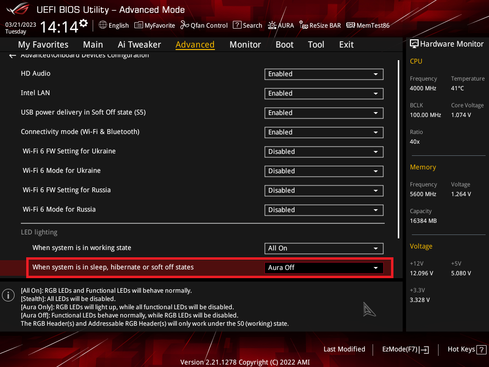 Section intitulée « Paramètres AURA dans le BIOS »Les paramètres AURA sont parfois désactivés par erreur ou lors de la désinstallation d’AC ; assurez-vous qu’ils sont réglés sur “All On” lorsque le système est en état de fonctionnement, comme dans l’image ci-dessous :