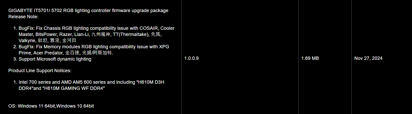 Ensuite, dans la section Support, vérifiez sous la catégorie Utility le pilote “GIGABYTE IT5701/5702 RGB lighting controller firmware upgrade package”.