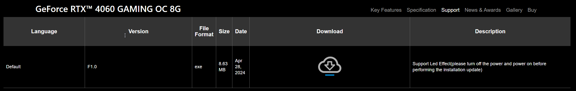 Section intitulée « Firmware LED »Certains GPU nécessitent une mise à jour du firmware pour avoir le contrôle LED. Il semble que certains GPU aient été livrés sans prise en charge du contrôle LED. Consultez la page de votre GPU sur le site Gigabyte et accédez au téléchargement du firmware :