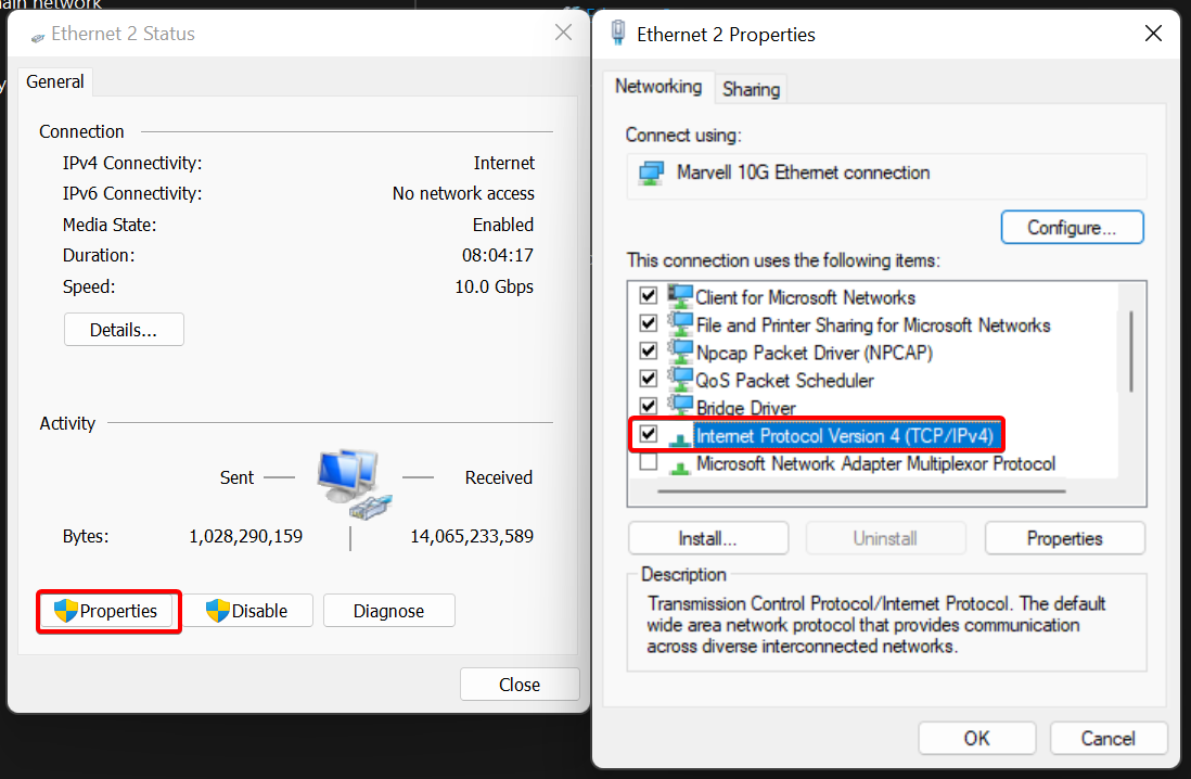 Cliquez sur votre adaptateur réseau et sélectionnez Propriétés. Ensuite, assurez-vous que la case à côté de Protocole Internet version 4 est cochée.