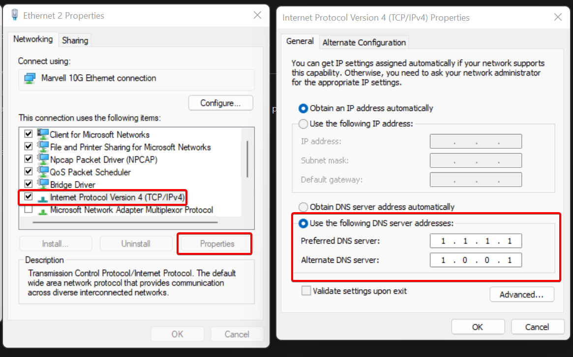 Ensuite, sélectionnez Propriétés. Dans la fenêtre contextuelle qui s’ouvre, sélectionnez Utiliser les adresses de serveur DNS suivantes : et entrez 1.1.1.1 et 1.0.0.1. Ensuite, cliquez sur OK sur toutes les boîtes de dialogue ouvertes.